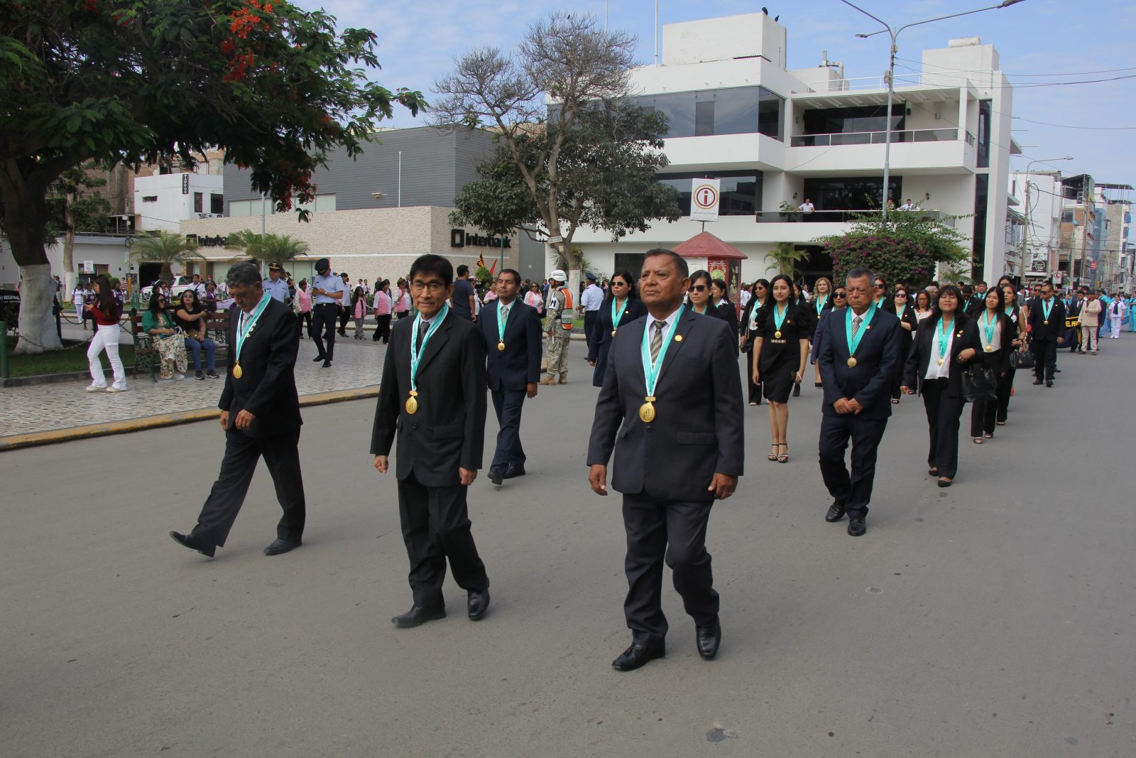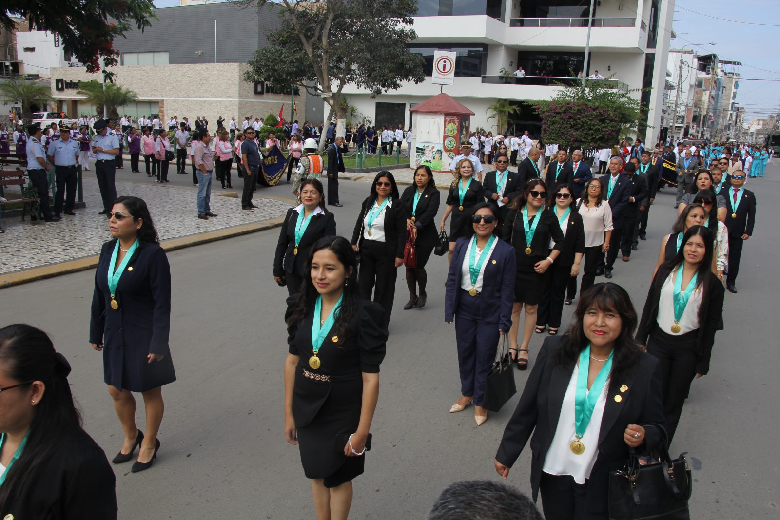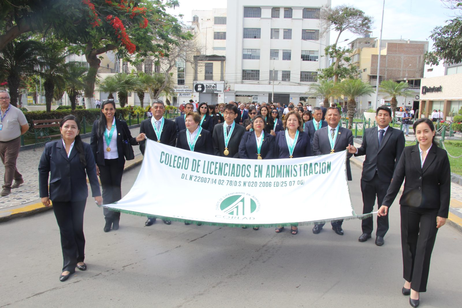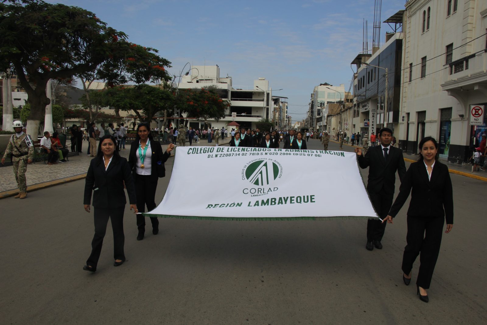 Posteriormente, desfilamos con orgullo portando el emblema de nuestro colegio, encabezados por la Administradora, Lic. Angela Huidobro Romero, junto a miembros de la Junta Directiva: