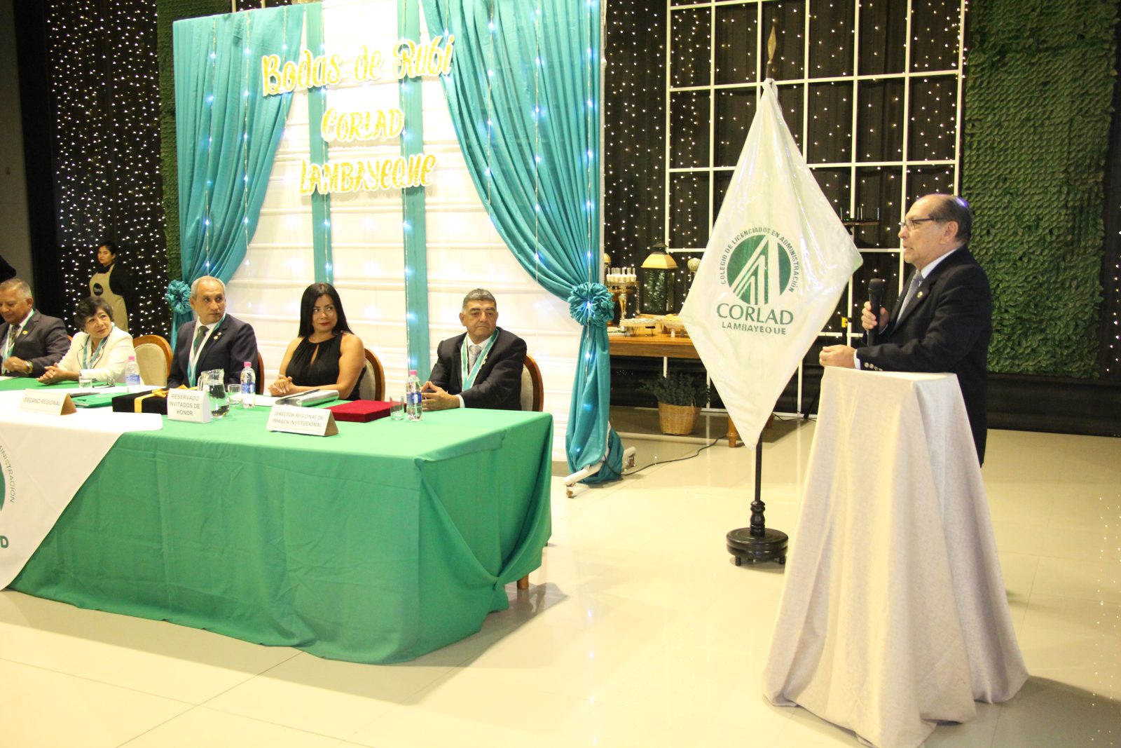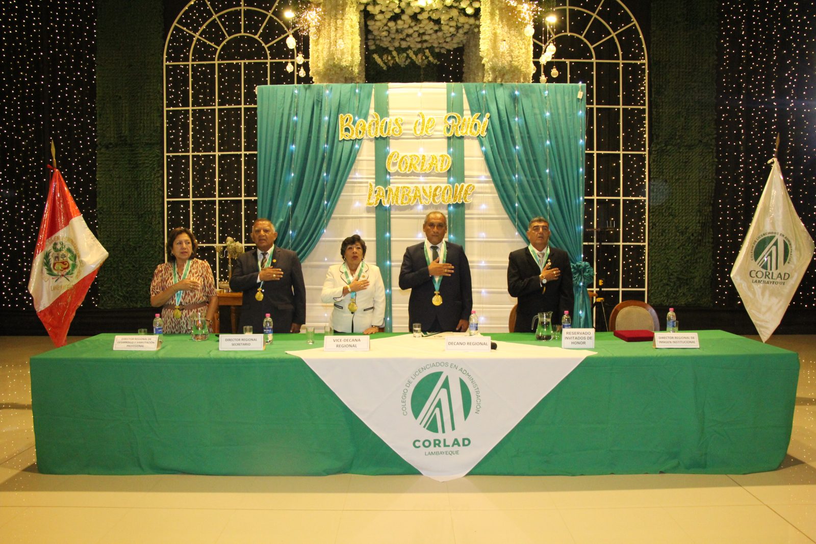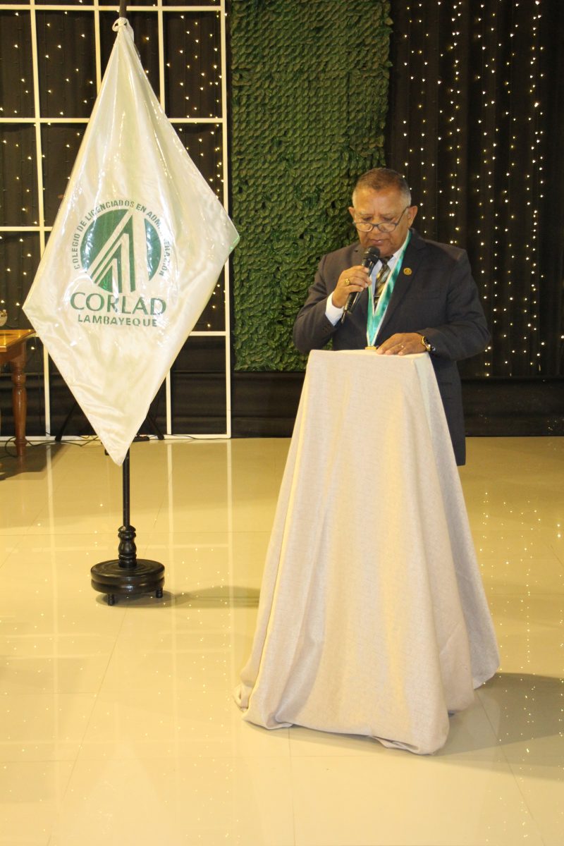 La velada comenzó con la entonación del Himno Nacional del Perú, seguido del Himno a Chiclayo y el Himno del Colegio de Licenciados en Administración, resaltando el compromiso de la institución con el desarrollo profesional y la identidad regional. Posteriormente, el Dr. José William Córdova Chirinos presentó una reseña histórica de la institución, recordando los hitos más importantes de estas cuatro décadas de trabajo.