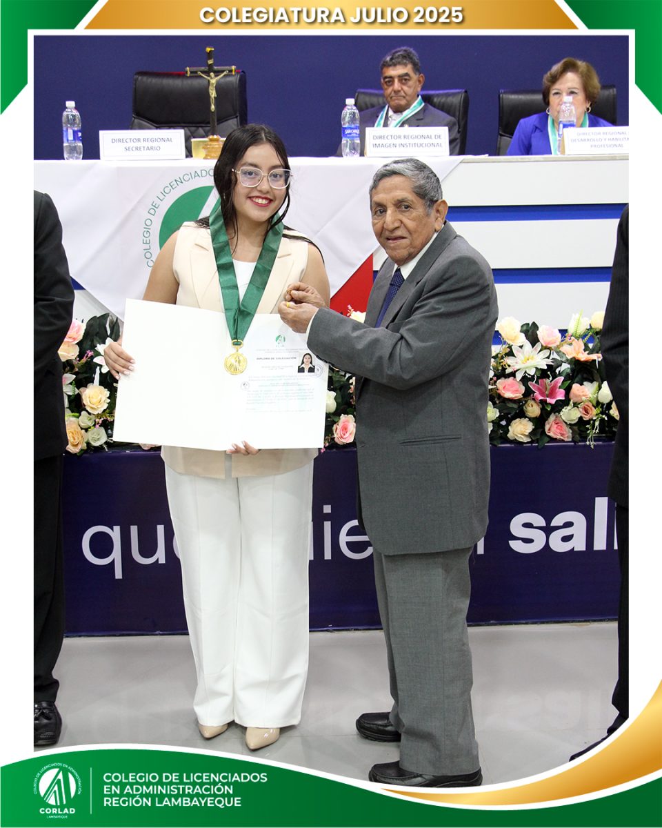 Seguidamente, el Dr. José William Córdova Chirinos, Director Regional Secretario, tuvo a su cargo la lectura de la resolución oficial de incorporación, así como la imposición de medallas a los nuevos colegiados. Su presencia activa durante toda la ceremonia simbolizó el respaldo institucional del Consejo Directivo a los nuevos miembros.