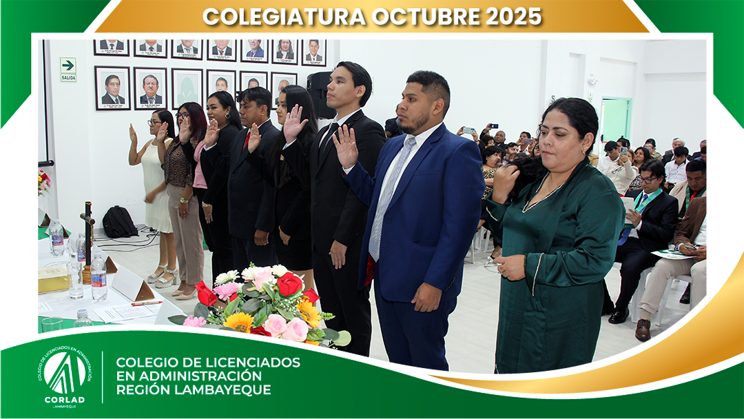 El sábado 4 de octubre de 2025, desde las 9:00 a. m., se realizó en el Local Institucional del Colegio de Licenciados en Administración – Región Tacna, ubicado en la Av. Santa Rosa Mz. I Lt. 15, Urb. Las Palmas, Chiclayo, la ceremonia de colegiatura correspondiente al mes de octubre, en la que nuevos profesionales se incorporaron oficialmente a nuestra orden.
