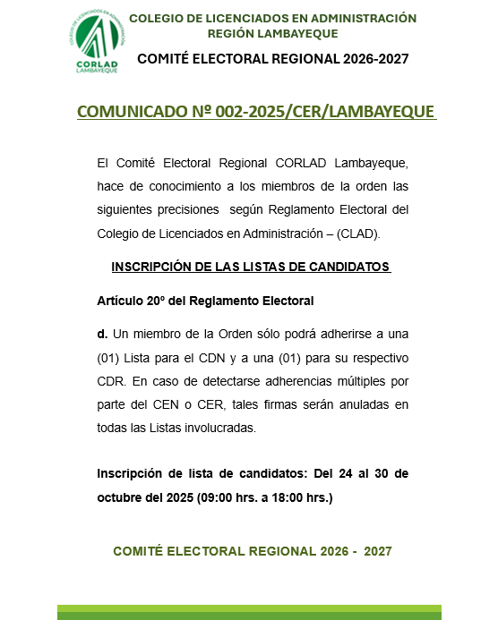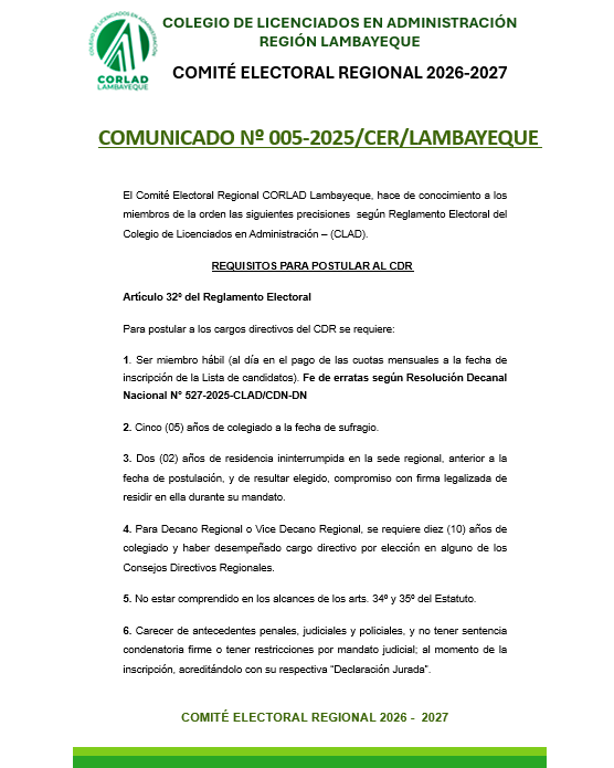 10. Candidato a Decano y Vice Decano presentar constancia de haber pertenecido al Consejo Directivo CORLAD Tacna.